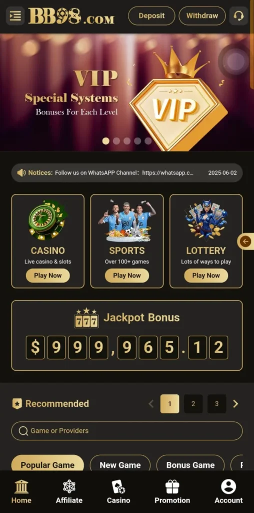 BB98 Game is an online casino-style gaming application designed for players who want to earn real money. It offers a wide range of games, including slots, lottery, sports betting, fishing games, and card games. Instead of using multiple apps, users can access all these features in one place. This makes the experience smooth and user-friendly.