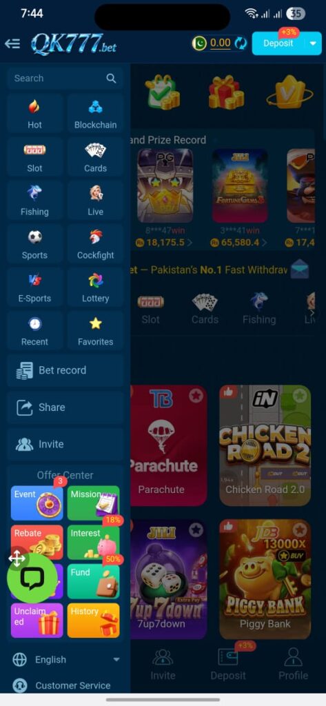 QK777 supports Pakistani gateways like Easypaisa, JazzCash, and bank transfer, ensuring quick deposits and instant withdrawals.