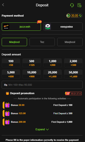 Depositing money is simple and secure. The platform supports Easypaisa, JazzCash, and direct bank transfers. Transactions usually reflect instantly, which means you can top up and start playing without waiting. VG-70 Game APK also ensures every deposit is encrypted, keeping your funds safe.